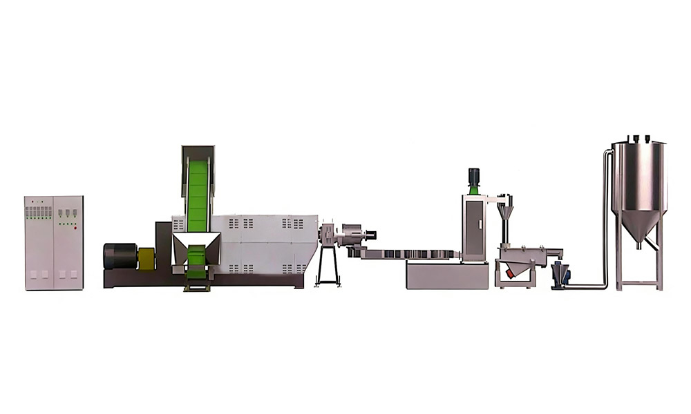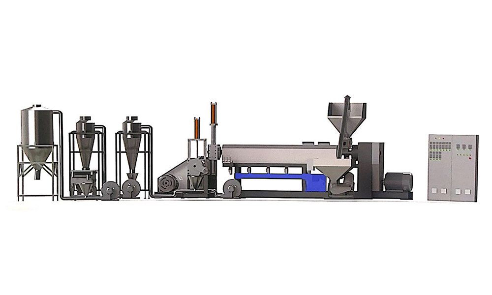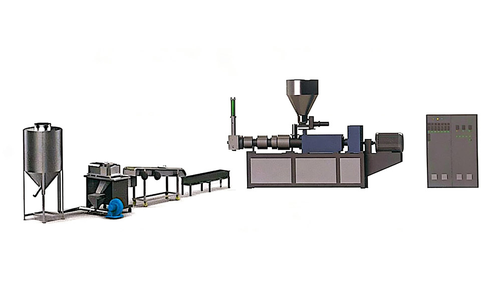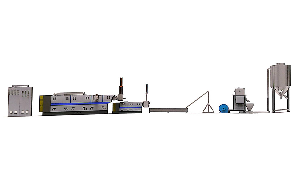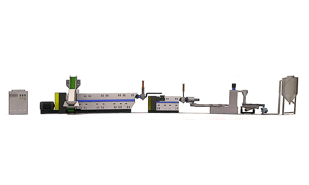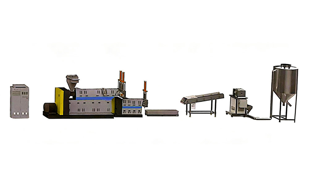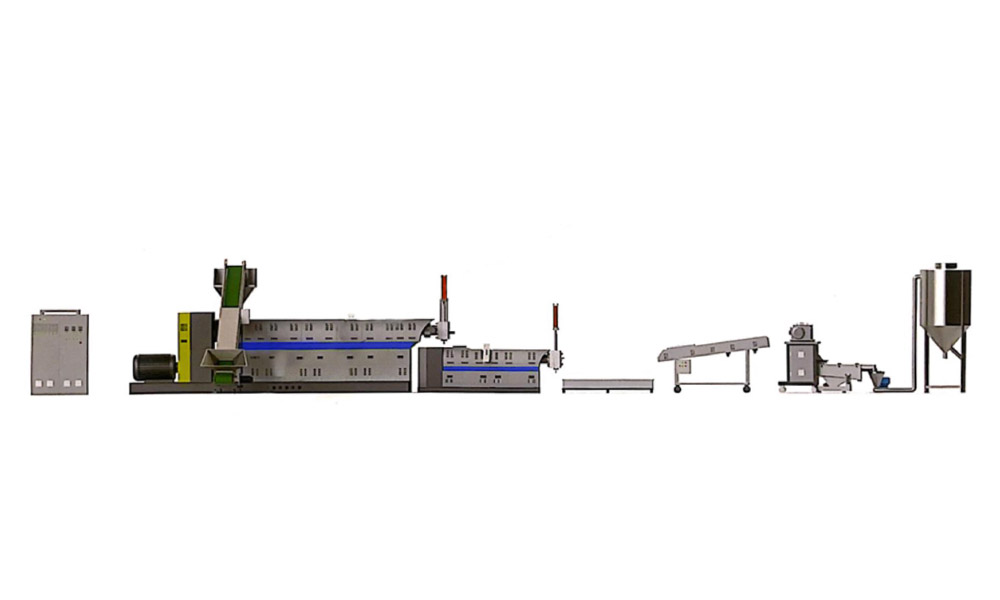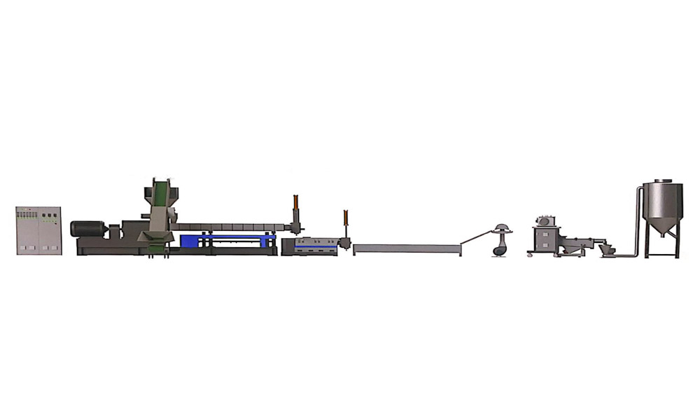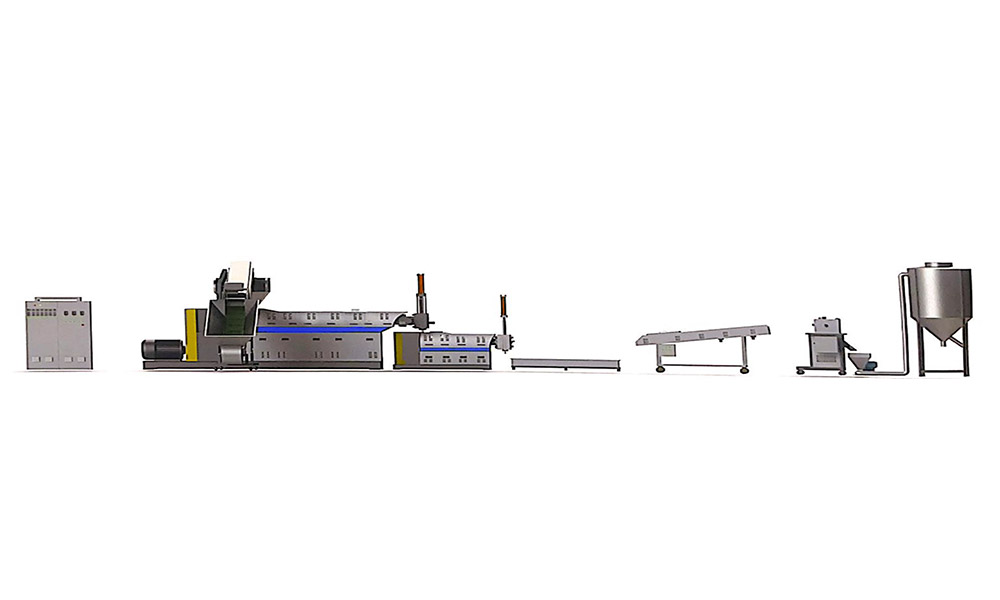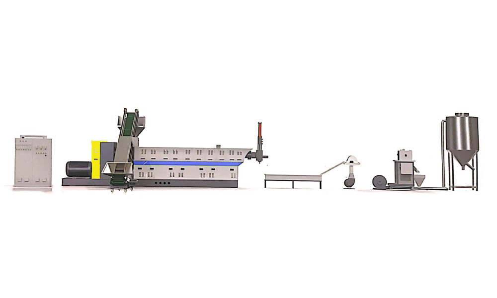 粉碎料单阶造粒机组适用于各类常见的工程塑料, PC. PA, ABS, PP, PS, PE, PPR, POM, PBT, PET 等 单阶设计,工厂边角料选择 可按客户需要选配喂料机,真空排气,输送带等